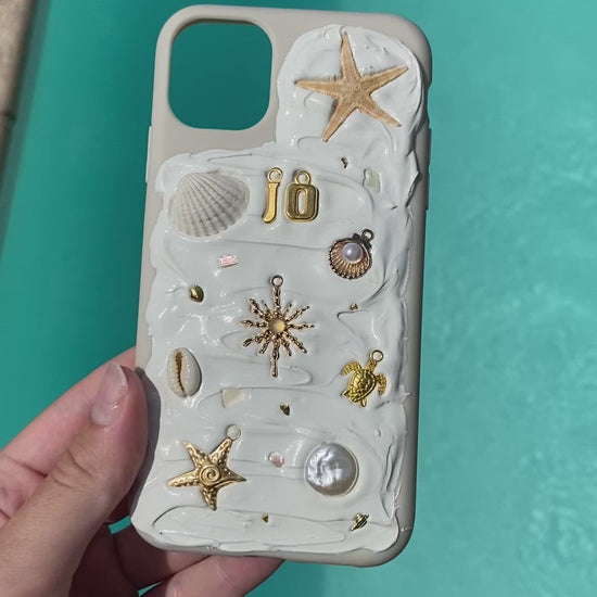 Coque réalisée avec des coquillages ainsi que des petites breloques apposées sur une pâte blanche qui fixe le tout.